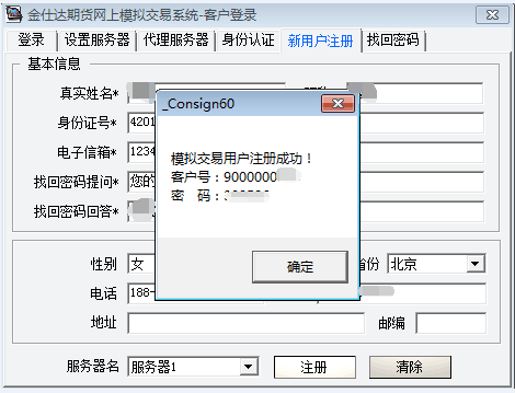 4.1-2分钟后,系统弹出“模拟交易用户注册成功”,并告知客户号及密码